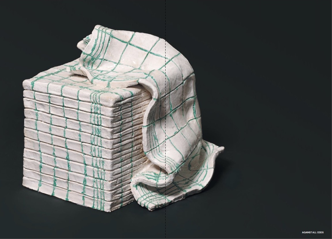 Mit Blick auf diese kultur- und kunstgeschichtliche Tradition lassen sich die aktuellen Arbeiten Marco Zumbés nicht nur als künstlerisches und formales Experiment, sondern mehr wie eine exemplarische Studie zum Thema des Inte rieurs begreifen. In früheren Werken widmete er sich bereits Oberflächen und Alltagsgegenständen des Interieurs – mit den Küchentüchern spitzt er diese Betrachtung jetzt wie unter einem Brennglas zu. Die Tücher, die in der täglichen Hausarbeit zum Einsatz kommen und die in Anlehnung an den Materialgedanken der Arte Povera als „armes Material“ gelten können, werden zwar nicht selbst als künstlerisches Material genutzt, sondern vielmehr zum Bildgegenstand erhoben. Der Künstler dekliniert verschiedene „Zustände“ der Gebrauchstextilien durch: ausgebreitet, aber mit sanften Wellen und Falten versehen, bringt er sie auf die Leinwand; säuberlich gefaltet und gestapelt werden sie zu keramischen Skulpturen oder hängen scheinbar locker, nur ihrem eigenen Gewicht und der Schwerkraft folgend wie ein organisches Relief an der Wand.